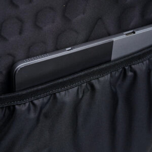Scomparto interno porta PC/tablet, tasca laterale porta borraccia in rete ed elastico, tasca frontale con zip waterproof metà rifrangente e metà opaca.